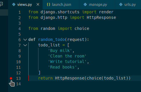 Now you can run the project for remote debugging in VS Code by hitting F5. Go to the todo/views.py file and add a breakpoint on line 13: