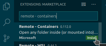 The next step is to install the Remote – Containers extension from the VS Code marketplace. Go to the Extensions section in VS Code and install the extension from there: